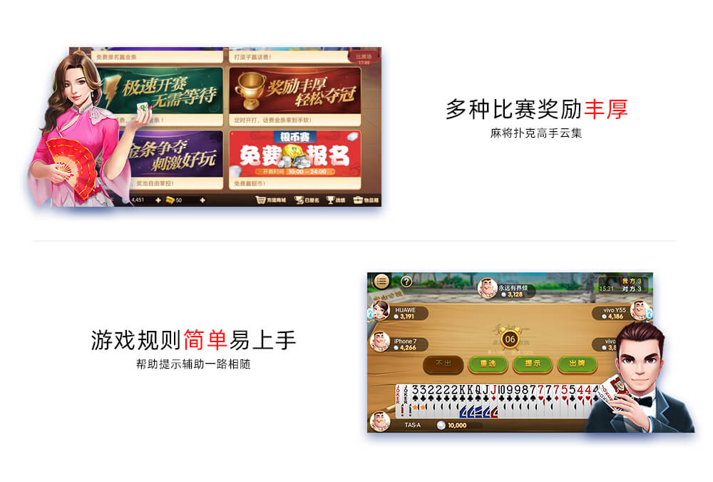 2)本游戏基于中国多地棋牌玩法设计,剧情简单,没有基于真实历史和现实事件改编内容。主要操作方法为操控虚拟牌手进行棋牌比赛,根据规则完成牌局目标。游戏中有少量的基于文字的陌生人社交系统,但社交系统的管理遵循相关法律法规。