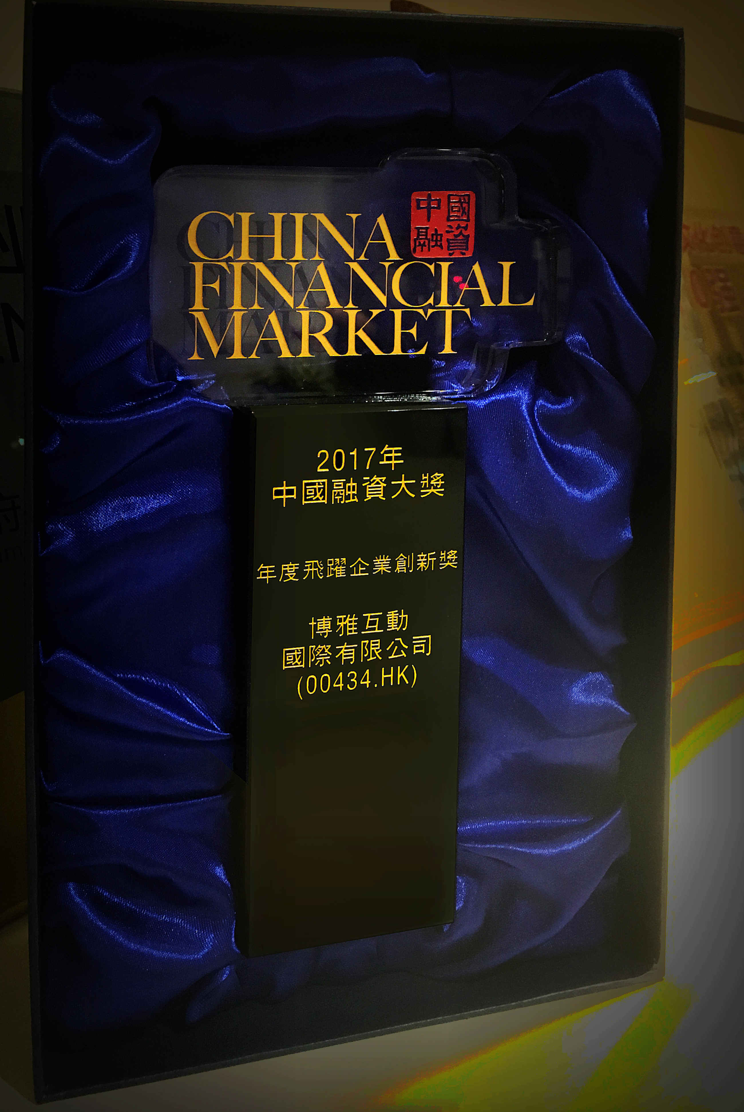 昨日, 由香港知名财经杂志《中国融资》主办的2017年“中国融资大奖”颁奖盛典暨庆祝晚宴于香港四季酒店隆重举行。博雅互动凭借2017年在资本市场的优异表现以及自身稳步发展的业绩,荣获“年度飞跃企业创新奖”。