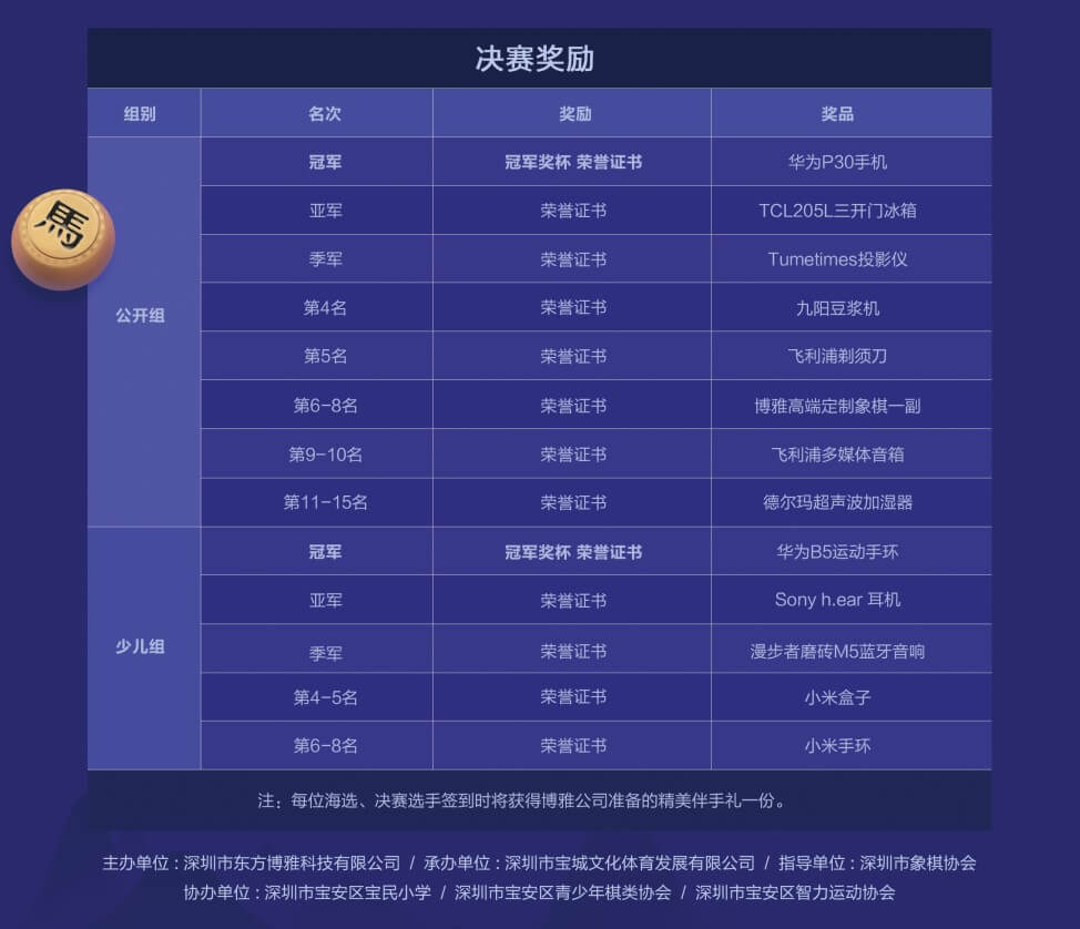 本次比赛由深圳市东方博雅科技有限公司(以下简称博雅互动)主办,深圳市象棋协会指导,深圳市宝城文化体育发展有限公司承办,深圳市宝民小学、深圳市宝安区青少年棋类协会、深圳市宝安区智力运动协会协办。本次比赛应众多专业团队协助,充分保证了赛事的专业性及公平性,同时为博雅互动打造全民竞技益智的棋牌赛事积累了丰富的经验、奠定了深厚的基础。