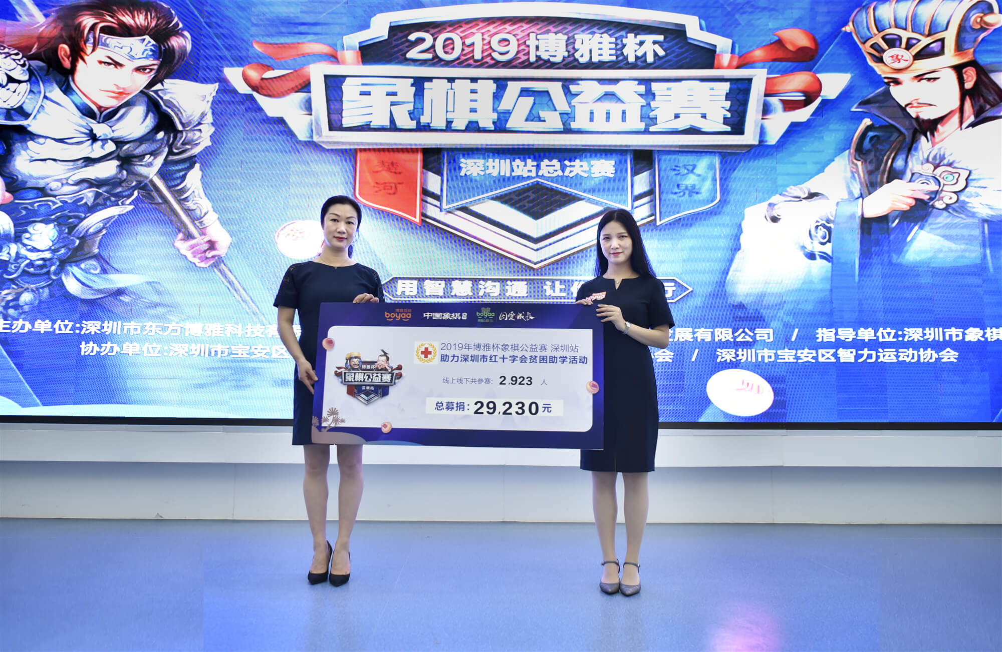 棋之以承,爱心接力。2019“博雅杯”象棋公益赛在传播象棋文化的同时,以线上线下相结合的方式开展公益活动,募集善款帮助贫困学生。每一位报名参加比赛的选手,博雅互动按比例进行配捐。在开展线下海选赛及总决赛时,现场放置红十字会募捐箱和捐款二维码,鼓励市民奉献爱心。捐赠仪式上,博雅互动向深圳市红十字会捐赠29304.5元,用于开展红十字贫困助学活动,帮助更多的学子享有公平而有质量教育的机会。