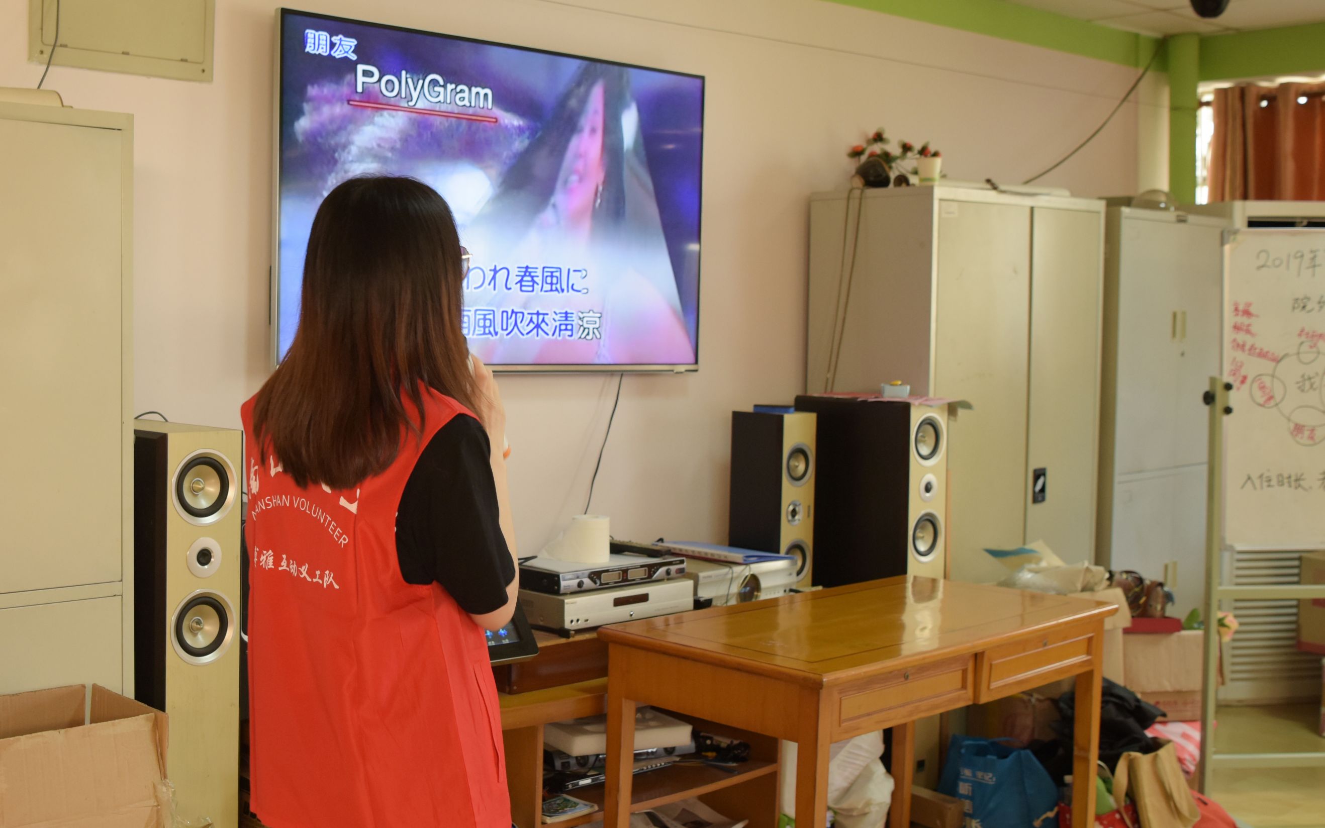 第一个节目是唱歌。活动室内设有KTV点歌系统,连接到电视投放,特意为爷爷奶奶们选了三首歌曲,第一首是为即将迎接中国成立70周年庆,组织现场一起《歌唱祖国》,共庆这伟大的时刻。第二首是邓丽君《夜来香》,由博雅互动义工队女队员独唱,美妙温馨的旋律让老人们走进时光记忆,到副歌部分,老人们也一起哼唱:“夜来香~~我为你歌唱~~”。第三首是周华健《朋友》,非常燃,与老人半句合唱“一句话”“一辈子”“一生情““一杯酒~~”。最后,有一位奶奶大赞义工歌唱得真好,现场一片欢声笑语。
