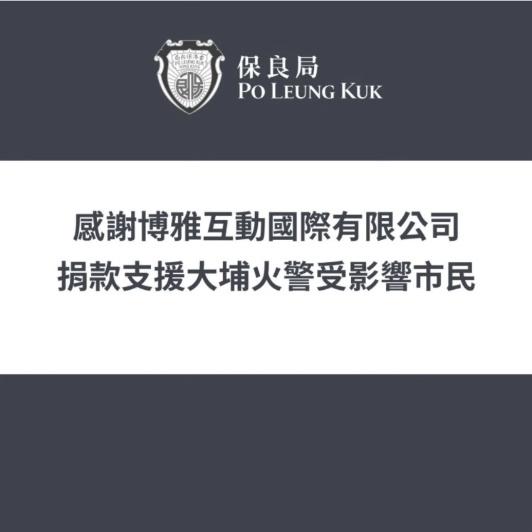 (2025年12月3日 - 香港) - 博雅互动国际有限公司(「博雅互动」或「公司」,连同其附属公司统称「集团」,股份代号:434.HK)宣布,已向「保良局扶弱基金 - 支援宏福苑火灾居民专项户口」捐赠100万港元以驰援香港大埔灾后重建。