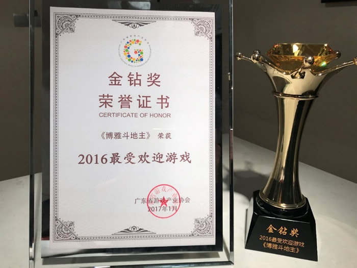 2016年“金钻奖”的评选历经两个月的时间,吸引了广东省内包括腾讯、网易、博雅互动在内的数十家优质游戏企业及旗下主打游戏参与评选,组委会按照网络投票占比30%、评委评分占比70%的总分计算规则,再综合专家评委会意见及企业相关数据指标,经过层层筛选决出最终的获奖名单。博雅斗地主凭借自身优质的游戏体验以及品牌影响力,与其余9家时下中国最热门的游戏经过层层筛选和角逐,共同荣获“最受欢迎游戏” 奖项,同时,博雅互动也获得组委会颁发的“广东省游戏产业协会优秀会员”奖。