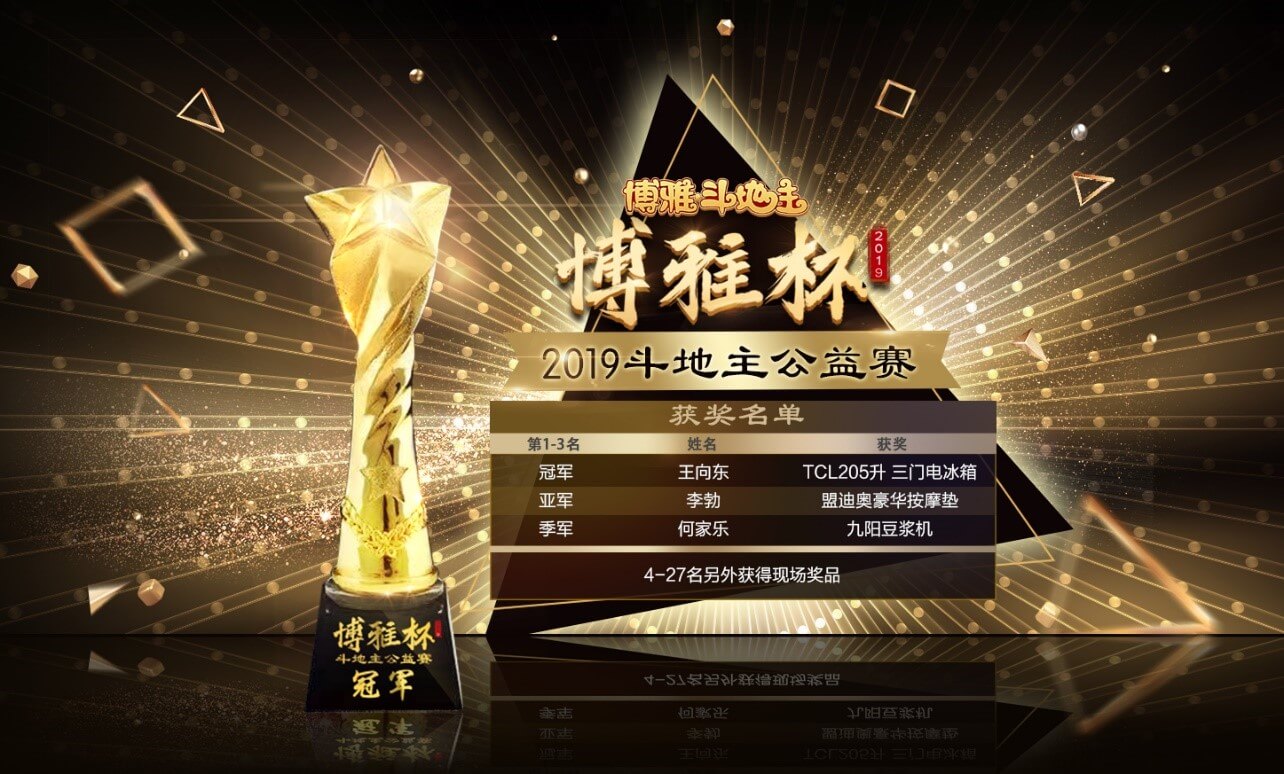 博雅互动为探索网络游戏与文化传承相结合,传递正向的社会价值观,竭力开启打造全民文化竞技的棋牌赛事品牌。从赛事到公益,再到社会公益理念推广,博雅互动举办的2019“博雅杯”斗地主公益赛决赛-长沙站正式于8月17日完美落幕,本次比赛由选手王向东披荆斩棘获得冠军荣耀。