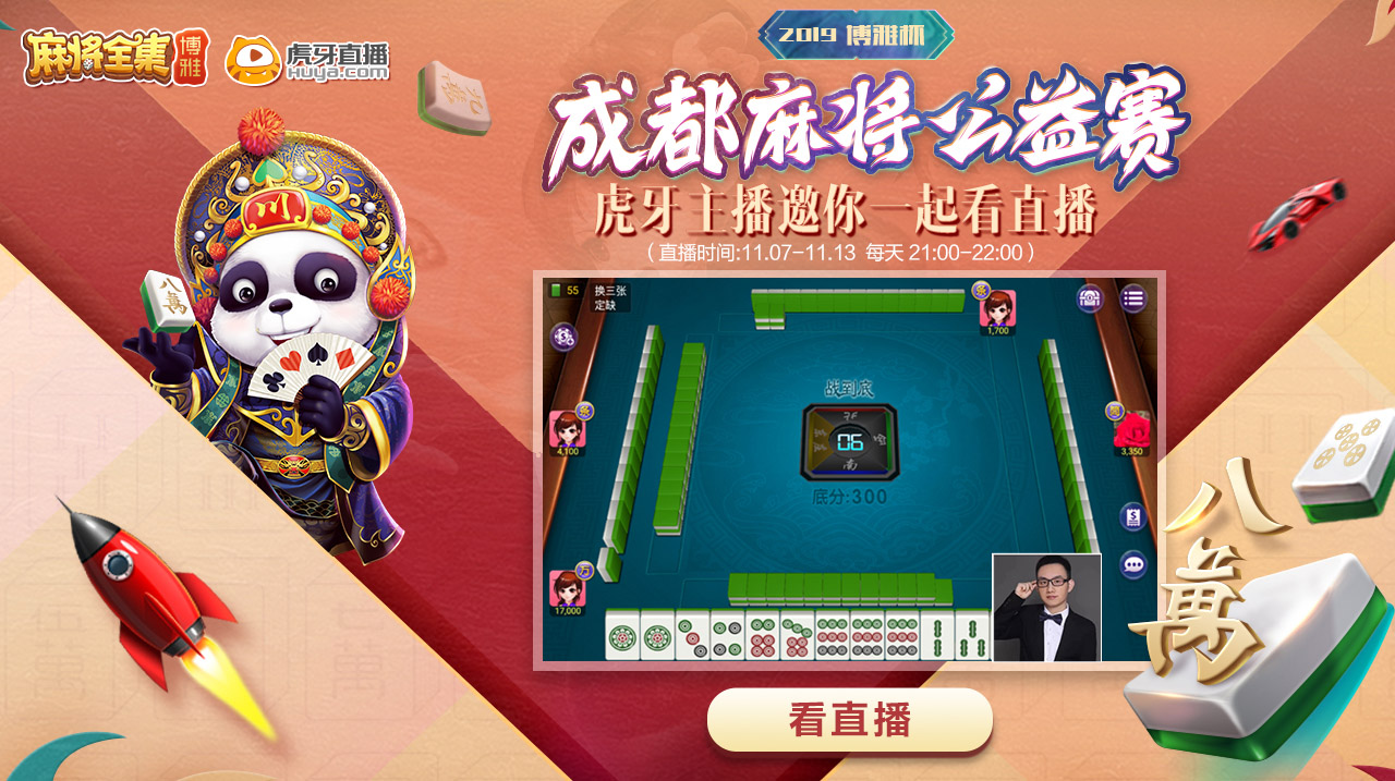2019“博雅杯”成都麻将公益赛线上海选赛于2019年11月7日-13日在“博雅麻将全集“APP正式开启。本次线上赛将与虎牙直播合作,特邀虎牙麻将专区两位人气主播尚娱-阿宽和嘉神666全程参赛并直播线上海选盛况,线上玩家可以与主播进行PK,角逐宝贵的线下赛参赛名额。